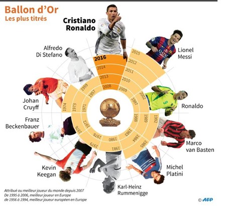 | Ronaldo devrait remporter son 5e ballon d'or jeudi 7 décembre et ainsi égaler Lionel Messi. |