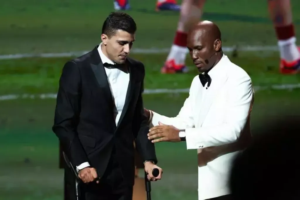 | Rodri (gauche) en béquilles lors de la cérémonie du Ballon d'or 2024 et aidé par l'ancien joueur de football ivoirien Didier Drogba, à Paris, le 28 octobre. |