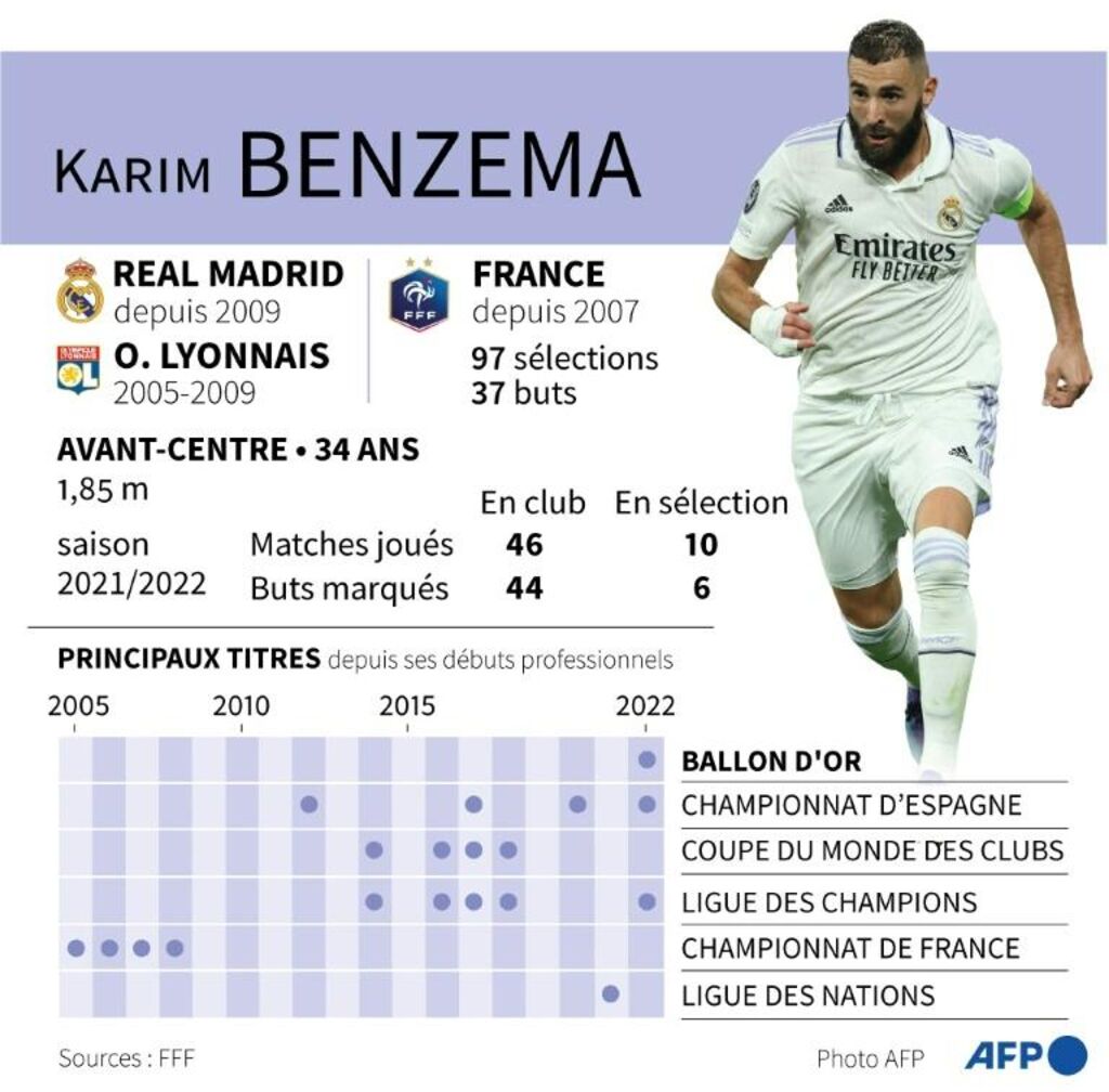 Benzema a quasiment tout gagné sur la saison 2021-2022 : Ligue des champions et Championnat d'Espagne en club, Ligue des nations en sélection, titres de meilleur buteur et de joueur d'Espagne en 2021-2022... Il est le cinquième joueur tricolore récompensé après Raymond Kopa (1958), Michel Platini par trois fois (1983-1984-1985), Jean-Pierre Papin (1991) et "Zizou" (1998).