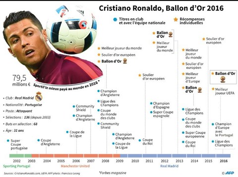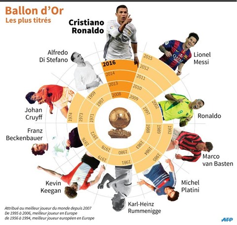 Le mode de désignation du Ballon d'Or a changé cette année. Ce n'est plus la FIFA qui le remet mais le journal France Football, comme par le passé, après le vote de journalistes de 173 pays. Le résultat est le même qu'en 2008, 2013 ou 2014 pour Ronaldo, 31 ans.
