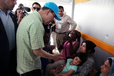 | Le secrétaire général de l'ONU Ban Ki-moon visite un camp de réfugiés à Mytilene le 18 juin 201 |