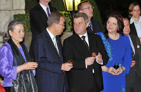 | Le secrétaire général de l'ONU Ban Ki-moon (2e, gauche) et le président macédonien Gjorge Ivanov (3e, gauche), le 24 juillet à Ohrid. Photo : Xinhua/VNA/CVN |