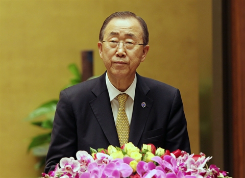 | Le secrétaire général de l'ONU, Ban Ki-moon, lors de la 9e session de l'Assemblée nationale vietnamienne (XIIIe législature), le 23 mai à Hanoi |