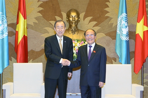 Ban Ki-Moon a apprécié le rôle de l'organe législatif vietnamien, notamment son succès dans l'organisation de la 132e Assemblée de l’Union interparlementaire (IPU-132) en mars dernier avec plusieurs questions importantes concernant le développement mondial. Il a également estimé les acquis vietnamiens en termes de réalisation des Objectifs du Millénaire pour le Développement (OMD), avant de se déclarer convaincu que le Vietnam serait un pionnier dans l'exécution des objectifs de développement durable dans la nouvelle période.