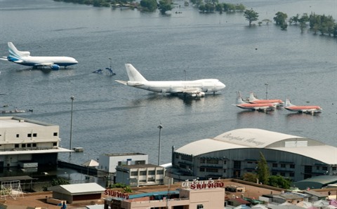 | Des avions sont parqués sur le tarmac inondé de l'aéroport de Bangkok, le 10 novembre 2011 lors d'inondations provoquées par la mousson. |