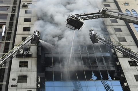| Des pompiers dans des nacelles de grandes échelles tentent d'éteindre l'incendie d'un immeuble de bureaux à Dacca, le 28 mars au Bangladesh. |