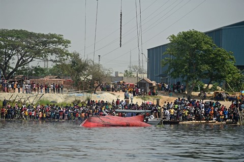| Des proches des victimes du naufrage d'un ferry au Bangladesh et des badauds regardent les opérations de secours sur la rivière Shitalakshya, le 5 avril. |