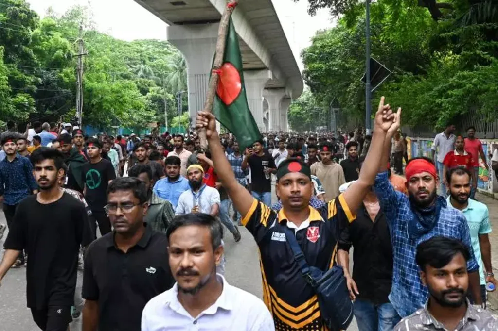 | Des manifestants réclament la démission de la Première ministre bangladaise Sheikh Hasina, le 4 août à Dacca. |