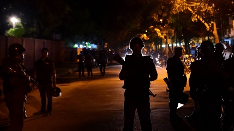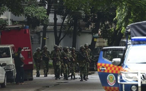 | Des forces de sécurité bangladaises sécurisent le périmètre à l'extérieur du restaurant où une prise d'otages revendiquée par le groupe EI était en cours, le 2 juillet à Dacca. |