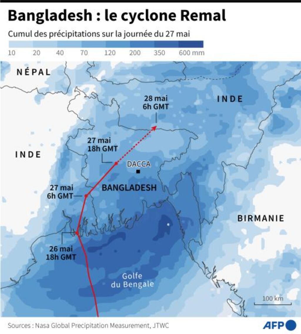 | Carte montrant la trajectoire du cyclone Remal et cumul des précipitations sur la journée du 27 mai. |