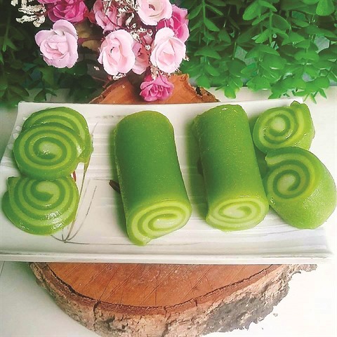 + Verser 2/3 du mélange dans un saladier. Ajouter le jus de pandan et quelques gouttes de colorant vert afin d’obtenir une couleur verte claire.