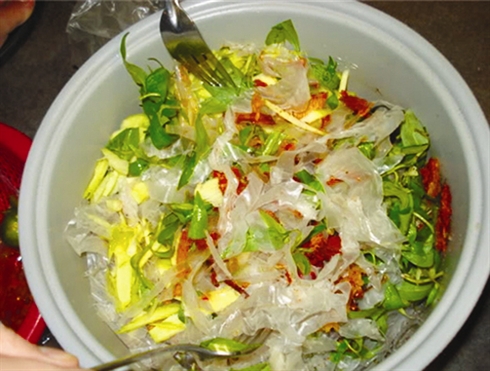 Cette salade est très populaire à Saigon, notamment auprès des étudiants et des enfants. La base de la salade ce sont les feuilles de riz, bánh tráng, coupées en lamelles. Les vendeurs de rues y ajoutent différentes sauces (ce qui permet de les humidifier) et ingrédients. À déguster directement sur un bout de trottoir.