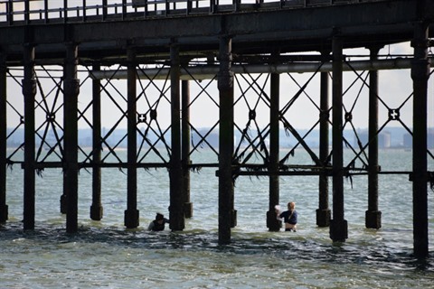 | Des scientifiques prélèvent des moules dans le cadre d'une mission de recherches sur les microplastiques, le 11 juin 2018 près de Londres. |