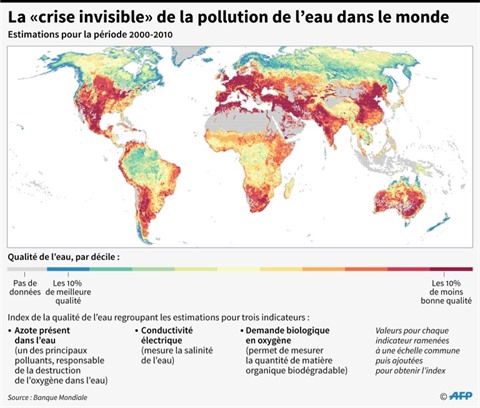 | Les pays dans le monde subissent de hauts niveaux de pollution de l'eau. |