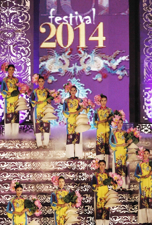 | Défilé en ao dài (tunique fendue traditionnelle des Vietnamiennes) à la cérémonie d’ouverture du festival. |