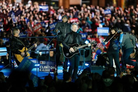 | Le chanteur Jon Bon Jovi sur scène lors du meeting de la candidate démocrate Hillary Clinton à Philadelphie, le 7 novembre. |