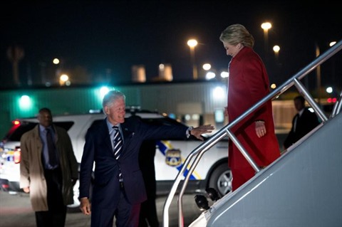 | L'ancien président des États-Unis Bill Clinton accompagne son épouse et candidate à la Maison Blanche, Hillary Clinton, à la descente de l'avion à Philadelphie, le 7 novembre. |