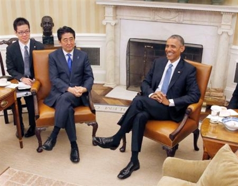 | Le président américain Barack Obama (droite) et le Premier ministre japonais Shinzo Abe, le 28 avril à la Maison Blanche. |
