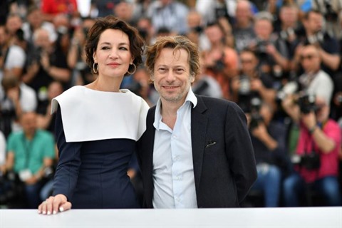 | L'actrice Jeanne Balibar (gauche) et le metteur en scène Mathieu Amalric, au festival de Cannes pour la présentation du film Barbara, le 18 mai 2017. |