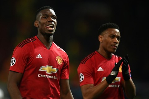 | Les Français de Manchester United, Paul Pogba (gauche) et Anthony Martial, après la défaite contre Barcelone le 10 avril à Manchester. |