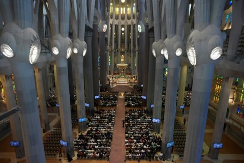 | Des personnes assistent à la messe à la mémoire des victimes des attentats en Catalogne dans la basilique de la Sagrada Familia, à Barcelone, le 20 août 2017. |