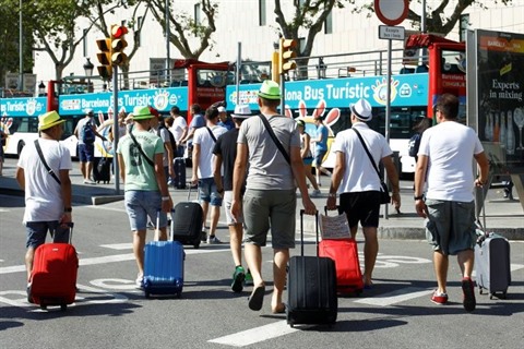 | Des touristes arrivent place de Catalogne à Barcelone, le 28 juin 2015. |