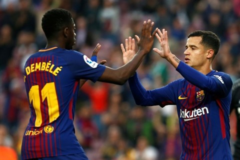 | Ousmane Dembélé et Philippe Coutinho se sont illustrés avec Barcelone contre Villarreal au Camp Nou, le 9 mai. |