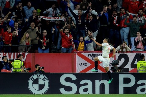| Wissam Ben Yedder ravi d'avoir ouvert le score pour Séville face au Real Madrid au stade Sanchez Pizjuan, le 9 mai. |