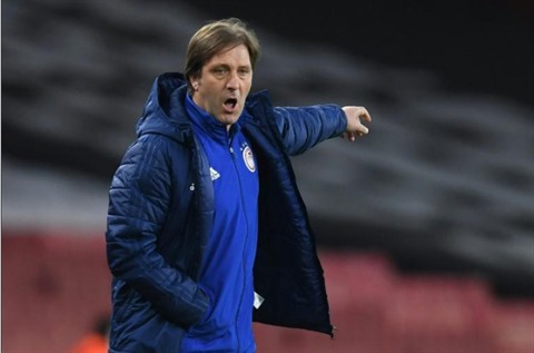 | Le coach de l'Olympiakos Pedro Martins lors d'un match de Ligue Europa contre Arsenal à Londres, le 18 mars. |