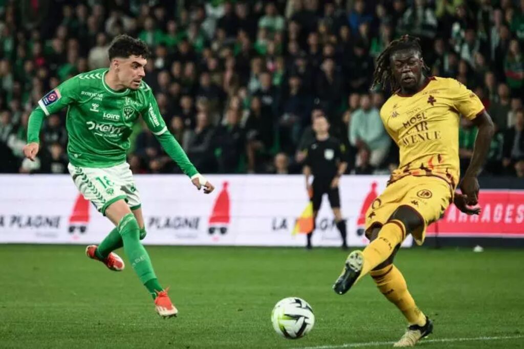 | Le Stéphanois Mathieu Cafaro (gauche) face au Messin Kevin N’Doram, le 30 mai à Saint-Étienne. |