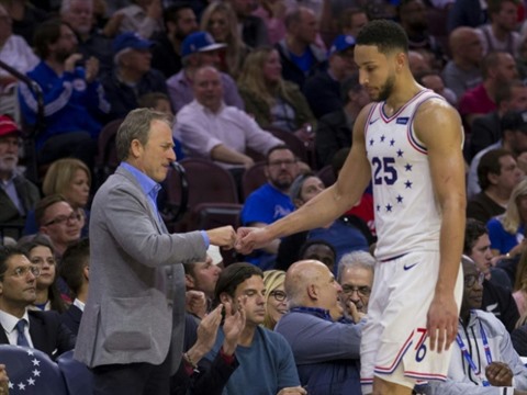 | Ben Simmons (droite) des Philadelphia 76ers est encouragé par le propriétaire de la franchise NBA Joshua Harris lors du match contre les Toronto Raptors, le 9 mai à Philadelphie. |