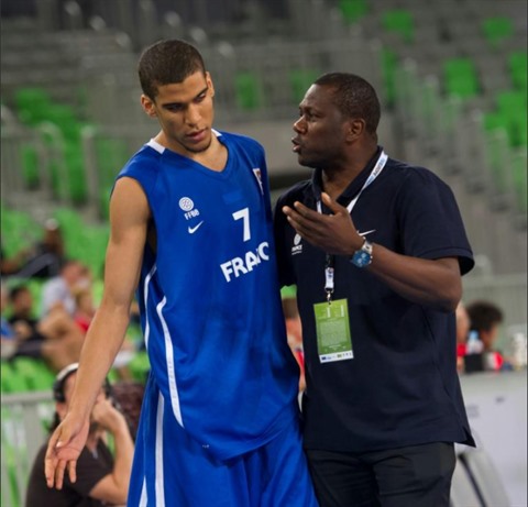 | L'entraîneur de l'équipe de France de basketball des moins de 20 ans, Jean-Aimé Toupane, discute avec Louis Labeyrie, lors de la demi-finale des Championnats d'Europe, le 21 juillet à Ljubljana (Slovénie). |
