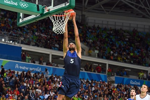 | Nicolas Batum avec l'équipe de France, lors des Jeux de Rio, contre la Serbie, le 10 août 2016. |