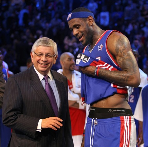 | David Stern (gauche) discute avec LeBron James lors du All Star Game 2008, le 17 février 2008 à La Nouvelle-Orléans. |
