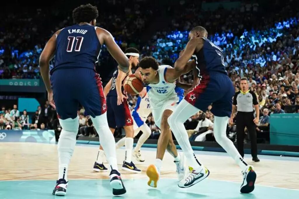 | Le Français Victor Wembanyama (centre) lors de la finale olympique contre les États-Unis, le 10 août. |