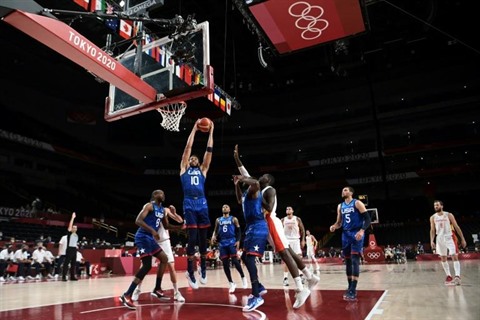 | L'Américain Jayson Tatum (2e, gauche) s'apprête à marquer lors du quart de finale des JO de Tokyo, le 3 août. |