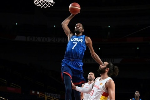 | L'Américain Kevin Durant (droite) lors du quart de finale des Jeux de Tokyo contre les Espagnols, le 3 août. |