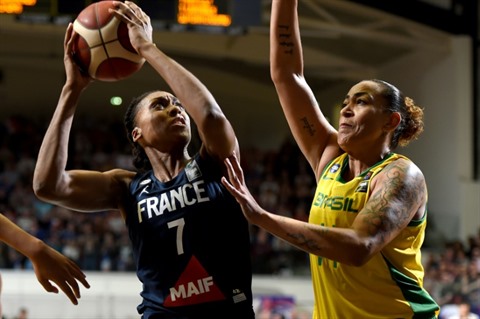 | La pivot française Sandrine Gruda lors du match entre l'Équipe de France et le Brésil en tournoi de qualification olympique en février 2020. |