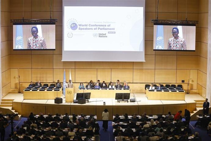 | Les participants au débat général de la 6e Conférence mondiale des présidents de parlement à Genève, en Suisse, le 29 juillet. |