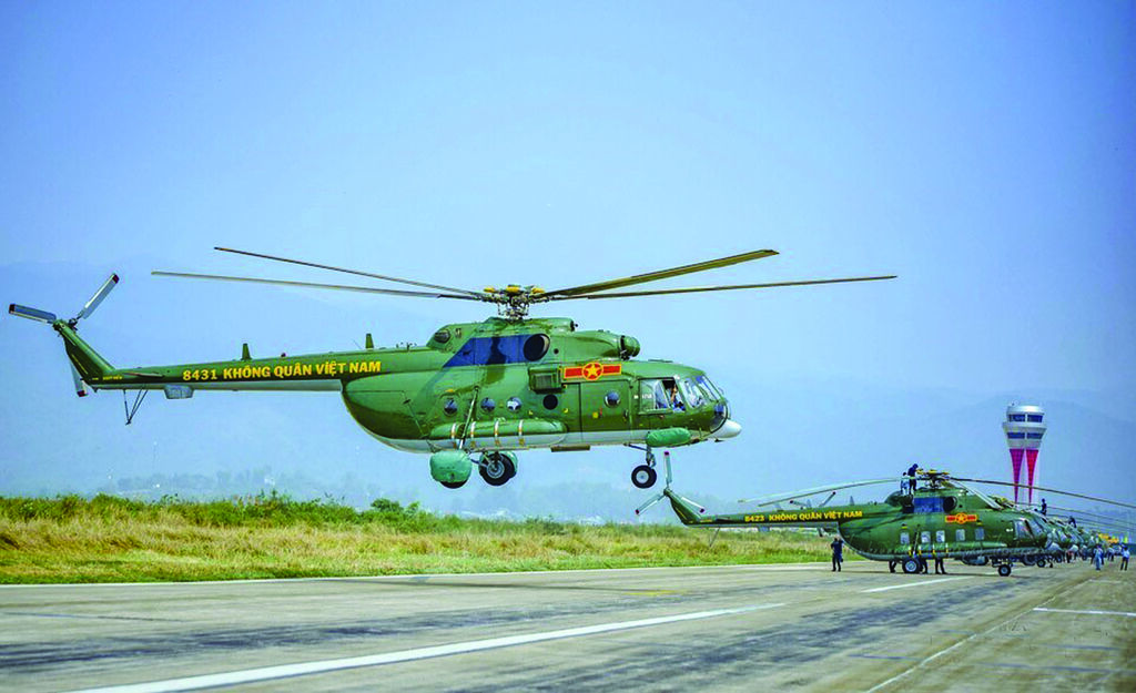 | Hélicoptères de l’Armée de l’air vietnamienne au défilé militaire en l’honneur du 70e anniversaire de la victoire de Diên Biên Phu, le 7 mai. |