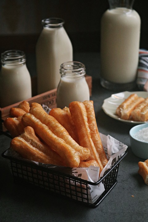 Déguster les bâtonnets de beignet avec le lait de soja tiède.