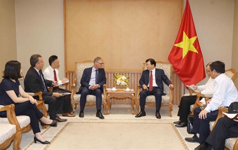 | Le vice-Premier ministre Trinh Dinh Dung (droite) a reçu Michael Dorner, directeur chargé des projets internationaux de la Bausparkasse Schwäbisch Hall, le 2 août à Hanoï. |