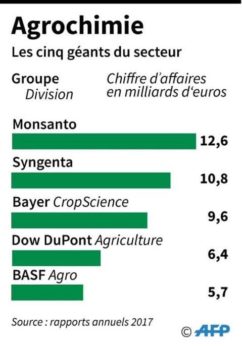 | Chiffres d'affaires des six géants ondiaux de l'agrochimie pour l'année 2017 en euros. |
