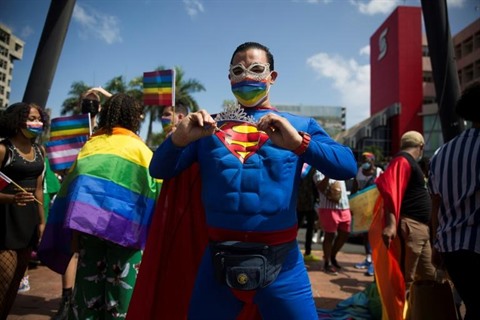 | Sur cette photo prise en juillet, un membre de la communauté LGBT déguisé en Superman participe à une manifestation en République dominicaine. |
