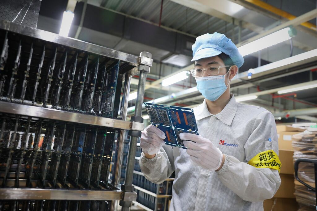 | Un ouvrier travaillant dans la chaîne de fabrication de la compagnie taïwanaise Fuhong, implantée à Bac Giang (Nord). |