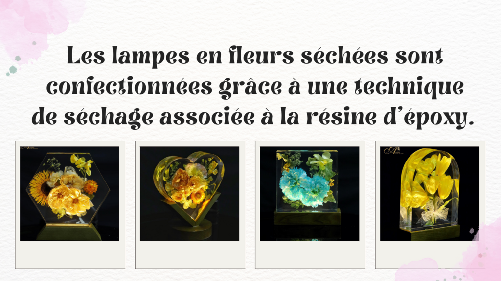 Tout d'abord, il faut choisir les plus belles fleurs avec des pétales épais, puis les tremper dans du gel de silice pendant 5 à 7 jours pour le séchage. Ensuite, on verse de la colle époxy dans un moule avant d’y disposer les fleurs selon les envies. Après quelques jours de séchage, on retire le moule puis le produit devra traverser encore 13 étapes de lissage. À la dernière étape, le produit est fixé sur une base pour devenir une lampe. Normalement, un produit fini nécessite 10 à 20 jours, selon le modèle. La particularité de ces lampes réside dans le fait que l’on peut les personnaliser, au goût des consommateurs.