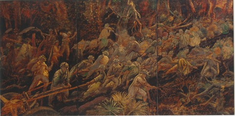 | La laque "Hissage d'un canon" de Duong Huong Minh. |