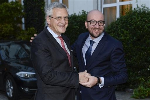 | Le coformateur Kris Peeters et Charles Michel (droite) propulsé Premier ministre après l'accord de coalition, le 7 octobre à Bruxelles. |