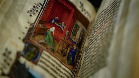 | Cette miniature de Jan van Eyck, "La naissance de saint Jean-Baptiste", dans les "Heures de Milan-Turin", figure dans l’exposition consacrée au maître flamand par le Musée des beaux-arts de Gand (Belgique). |