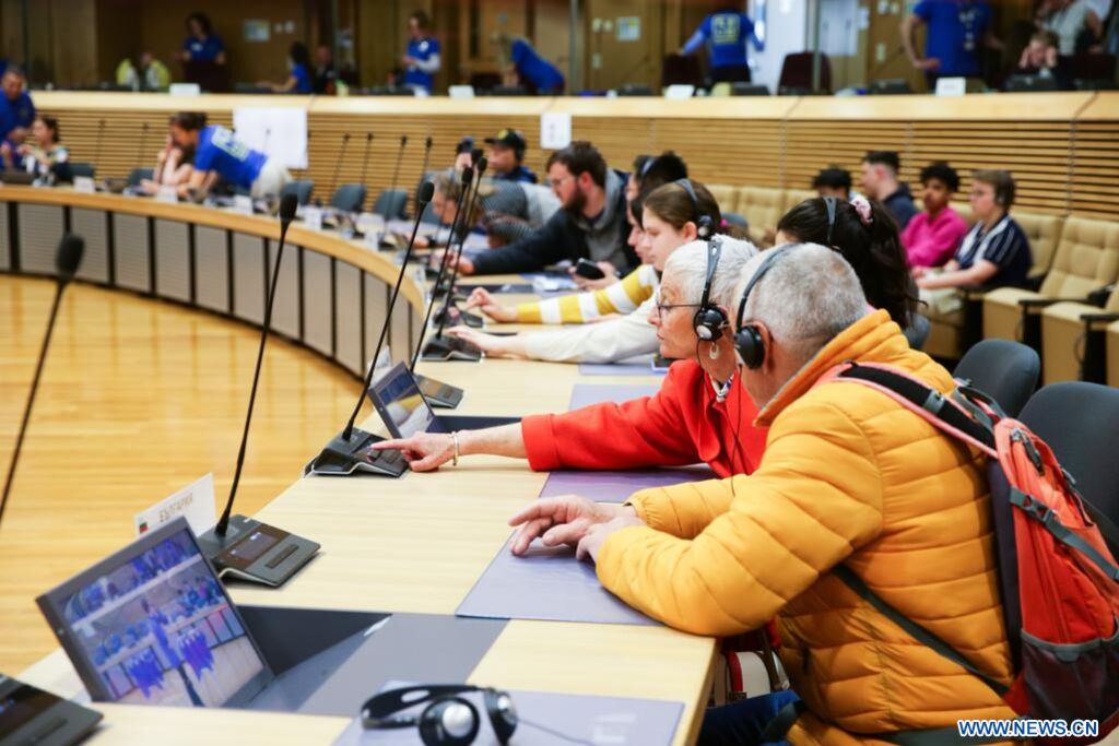 Des personnes visitent une salle de conférence dans le bâtiment de la Commission européenne lors de la journée portes ouvertes des institutions européennes à Bruxelles, en Belgique, le 6 mai.